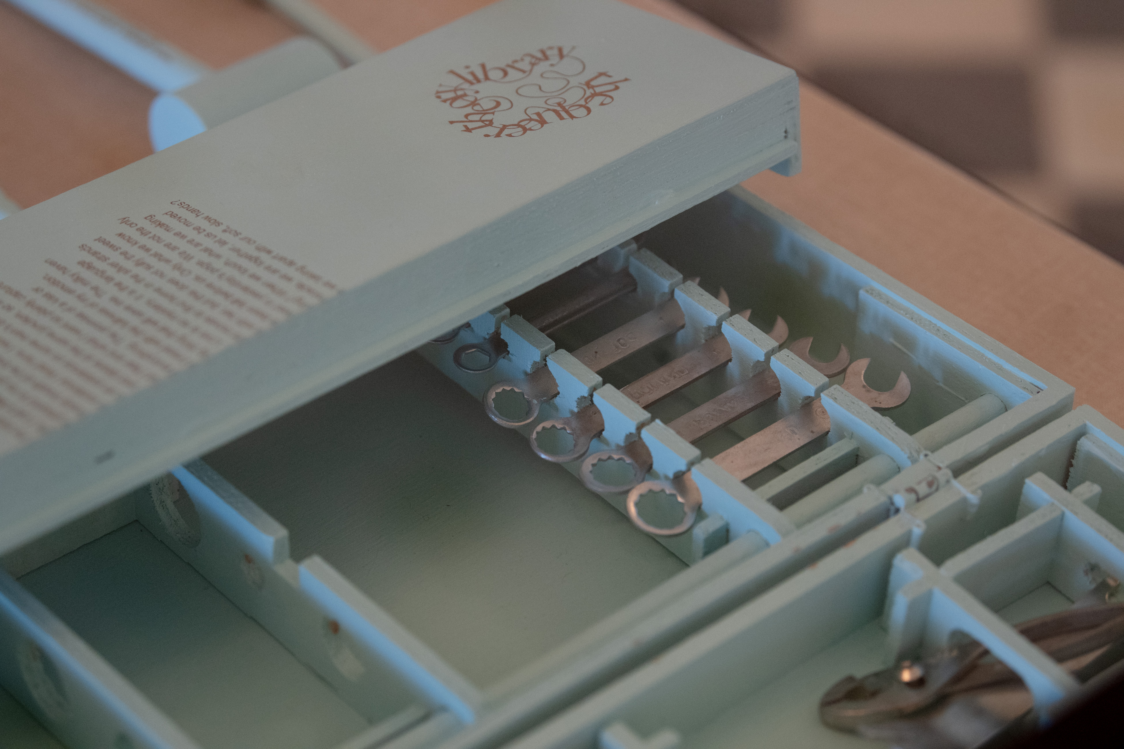 Written by Dani Janae, No New Pain is a series of poems made in response to Audre Lorde’s The Master’s Tools Will Never Dismantle The Master’s House, commissioned by The Queer Theory Library. Janae’s poems were then engraved on a set of hand tools, made to be functional and available to the public as a tool library that can be checked out for use and for reading.